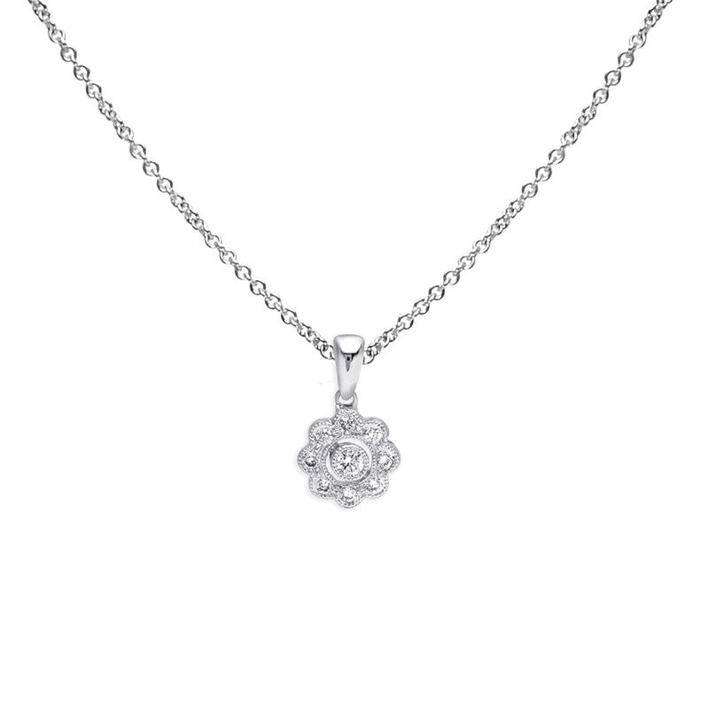 Sweet halo design with diamonds in white gold. There are 9 diamonds set in microprong settings and accented by tiny milgrain details. .16cttw. Adjustable 16'/18' chain.